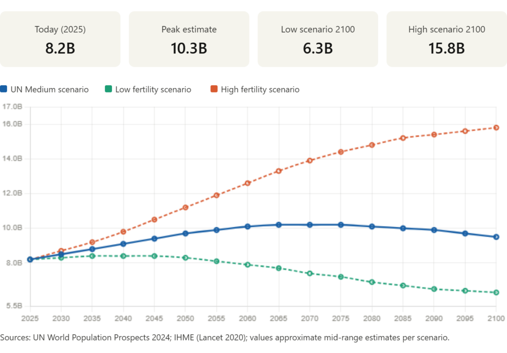 Will the global population start declining before 2100? Under the UN’s medium-variant scenario, the global population is expected to peak somewhere between 10 and 10.3 billion around 2080 to 2090, then begin a gradual decline. The low-variant scenario suggests an earlier and steeper decline. Whether and when the peak occurs depends heavily on fertility trends in high-population countries like Nigeria, India, and the Democratic Republic of Congo.
